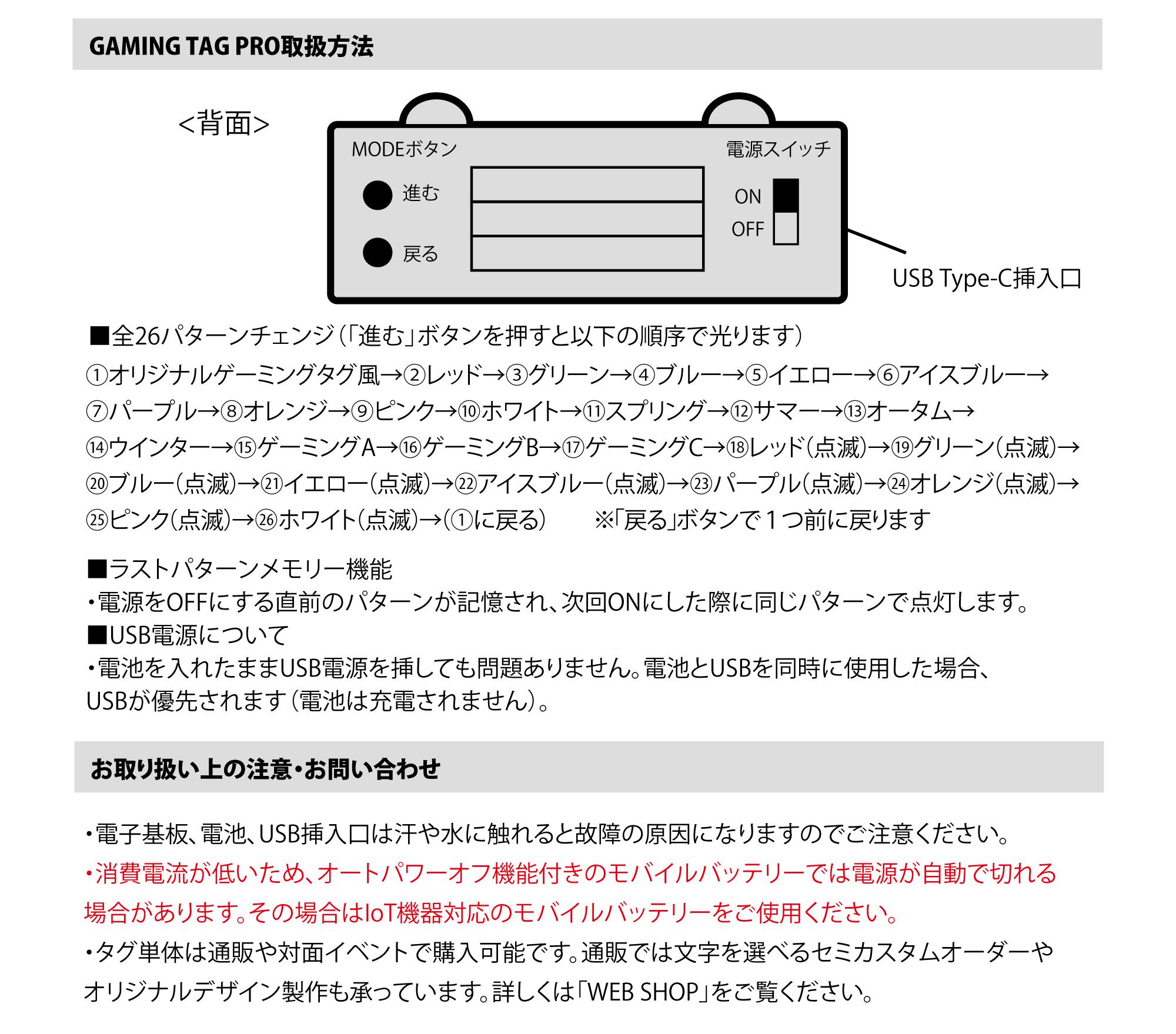 ①オリジナルゲーミングタグ風→②レッド→③グリーン→④ブルー→⑤イエロー→⑥アイスブルー→⑦パープル→⑧オレンジ→⑨ピンク→⑩ホワイト→⑪スプリング→⑫サマー→⑬オータム→⑭ウインター→⑮ゲーミングA→⑯ゲーミングB→⑰ゲーミングC→⑱レッド(点滅)→⑲グリーン(点滅)→⑳ブルー(点滅)→㉑イエロー(点滅)→㉒アイスブルー(点滅)→㉓パープル(点滅)→㉔オレンジ(点滅)→㉕ピンク(点滅)→㉖ホワイト(点滅)→(①に戻る)